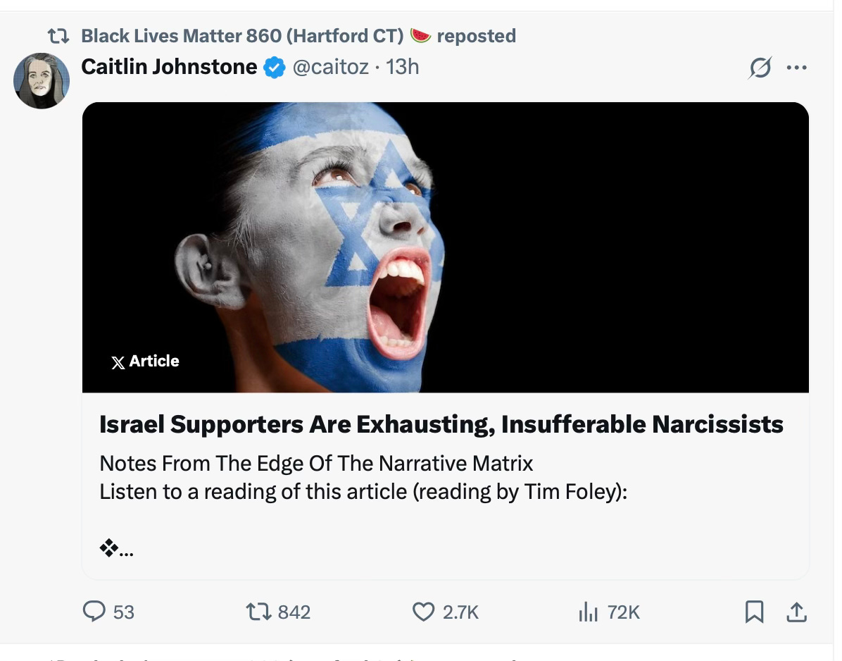 There’s nothing wrong with opposing war. There’s nothing wrong with believing the United States shouldn’t be involved in the Israel–Iran conflict. Reasonable people can disagree on policy, strategy, or humanitarian priorities. But Caitlin Johnstone isn’t making a case for peace — she’s making a case soaked in hate. She could express her opposition to war without mocking Jewish grief, without invoking Holocaust comparisons, and without repeating conspiracy theories about Jewish control of global politics. She chose not to. And BLM860 chose to amplify her anyway.