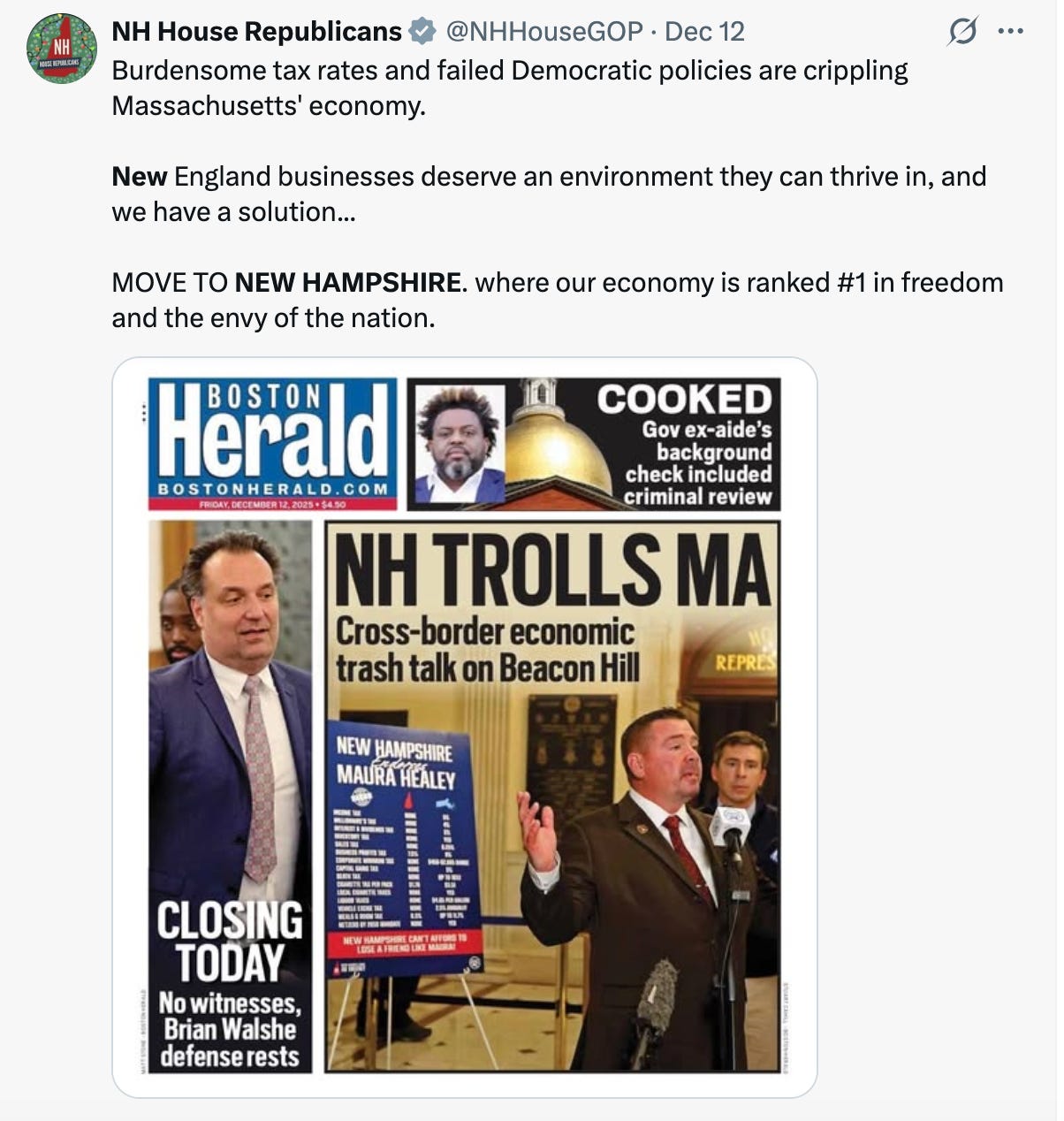 “Massachusetts Democrats and even New Hampshire Democrats like to push that New Hampshire is somehow dependent on the state of Massachusetts,” he said, adding that “[n]othing can be further from the truth.”