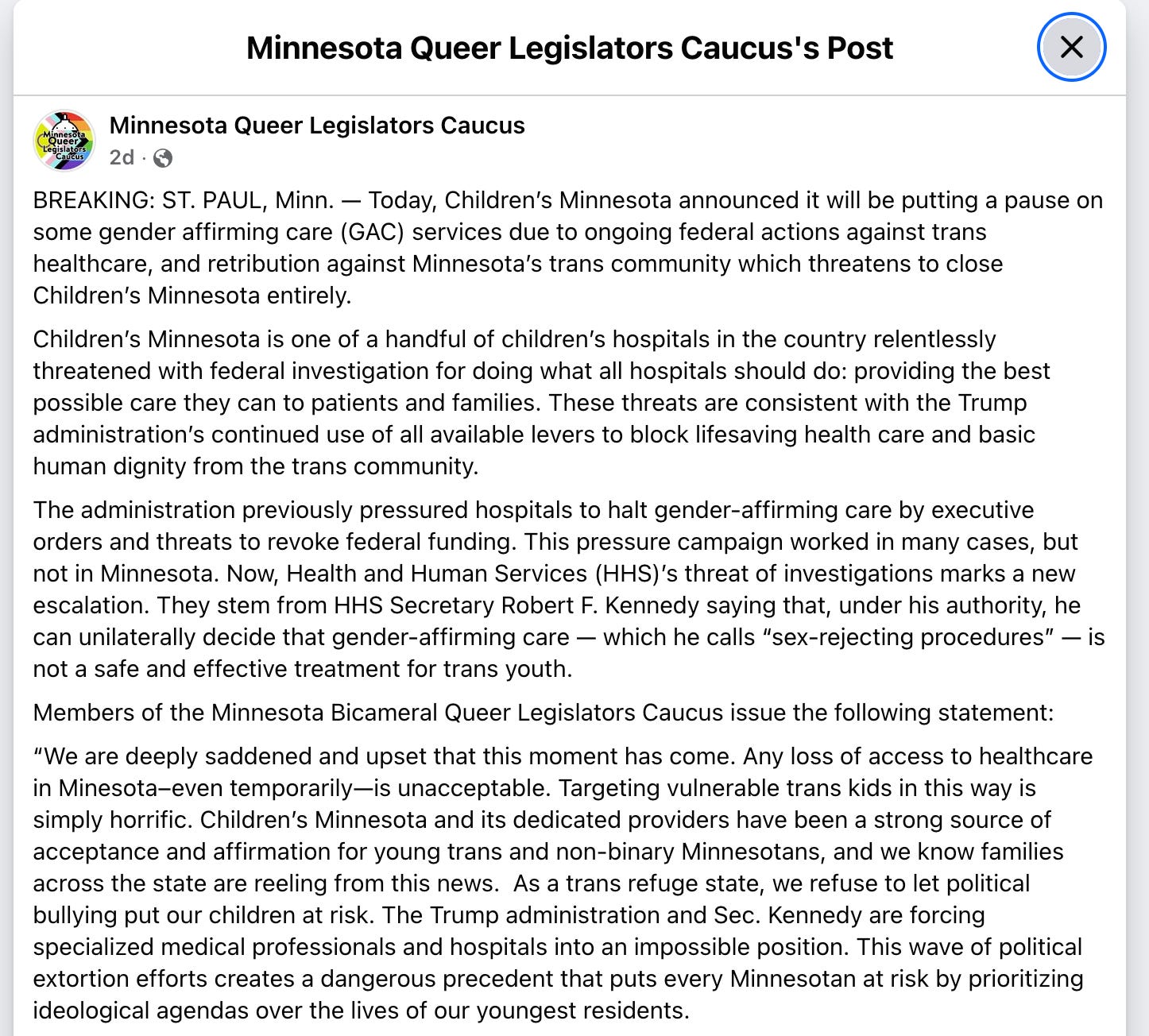 As Minnesota-based Alpha News reported, the “Minnesota Queer Legislators Caucus” responded on its Facebook account to the hospital’s suspension of its transgender medical treatments for minors.