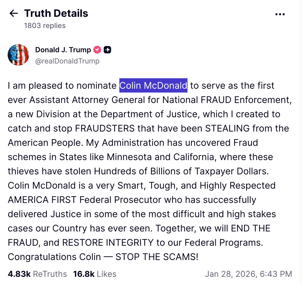The president announced Wednesday on Truth Social he had nominated Colin McDonald to the new position of Assistant Attorney General (AAG) for National Fraud Enforcement.